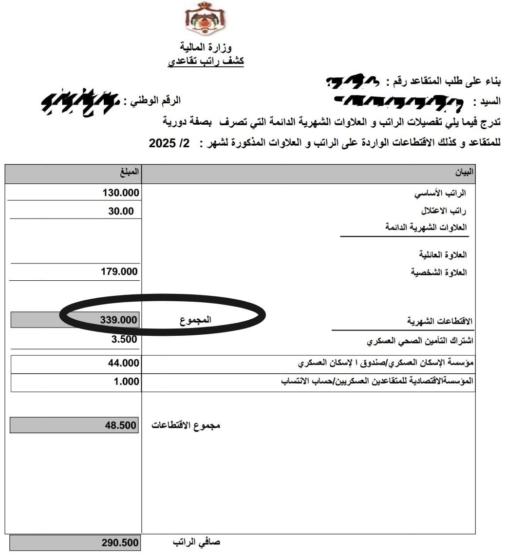 وفي الصورة ادناه يظهر ان الراتب الإجمالي (المجموع) "339" دينار اردني، وأن صافي الراتب "290.5"، وعليه يستحق المتقاعد العسكري زيادة فوق الراتب حتى يصل المجموع ل"350" دينار أردني.