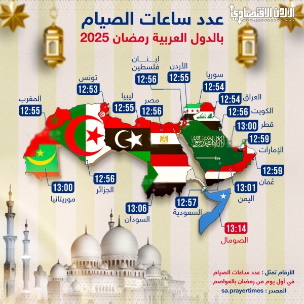 عدد ساعات الصيام بالدول العربية رمضان 2025