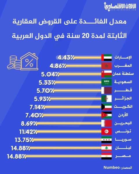 معدل الفائدة على القروض العقارية الثابتة لمدة 20 سنة في الدول العربية
