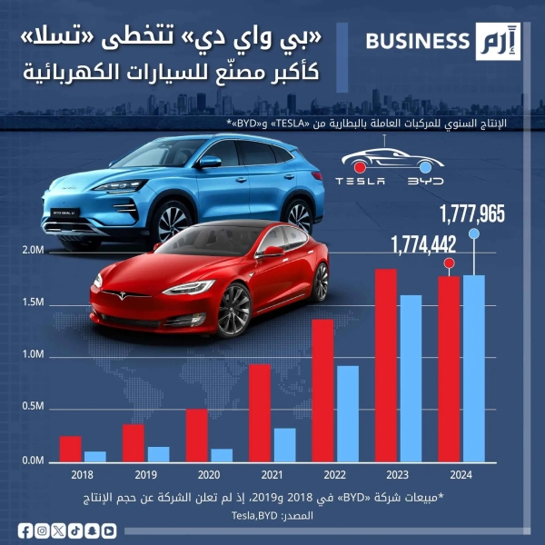 «بي واي دي» تتخطى «تسلا».. كأكبر مصنّع للسيارات الكهربائية