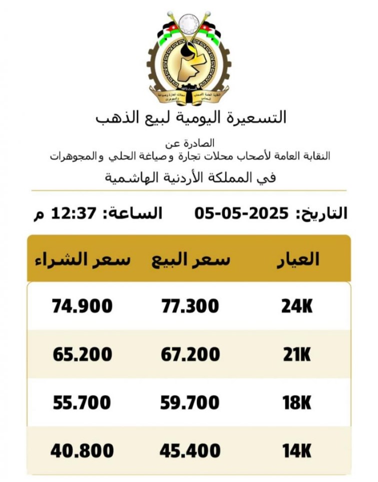 كما ارتفعت أسعار الذهب لعيارات أخرى، حيث بلغ سعر بيع الغرام من عيار 24 نحو 77.30 دينار، فيما سجل غرام عيار 18 سعر 59.70 دينار، وعيار 14 بلغ 45.40 دينار للغرام الواحد، وذلك لغايات البيع من محلات الصاغة.