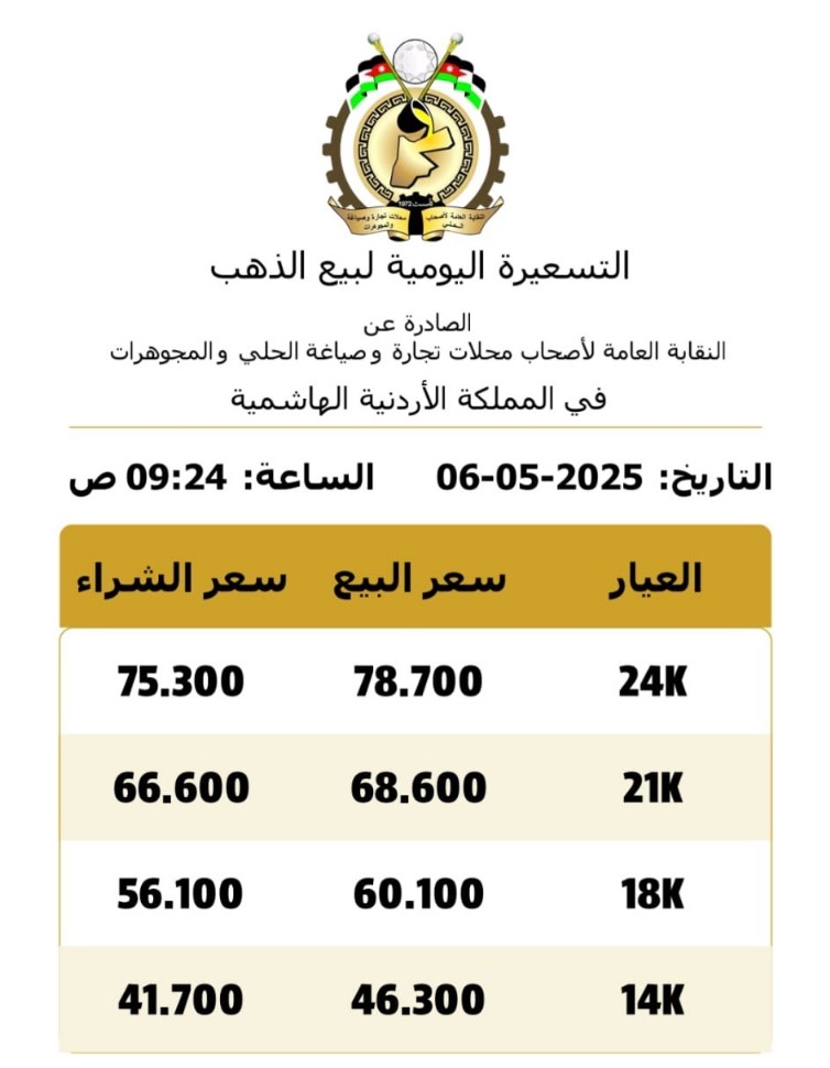 وبحسب التسعيرة الصادرة عن النقابة العامة لأصحاب محلات تجارة وصياغة الحلي والمجوهرات، بلغ سعر بيع غرام الذهب عيار 21، الأكثر طلبًا من المواطنين، 68.60 دينار، مقابل 66.60 دينار لجهة الشراء.