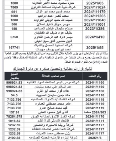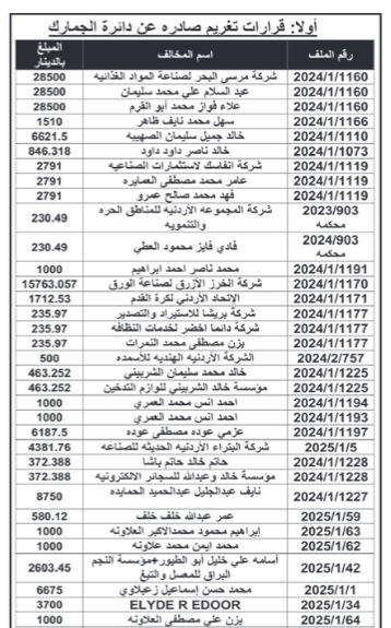 أعلنت دائرة الجمارك الأردنية، اليوم الخميس، عن إصدار قرارات تغريم ومطالبة وتحصيل بحق عدد من الأفراد والشركات.